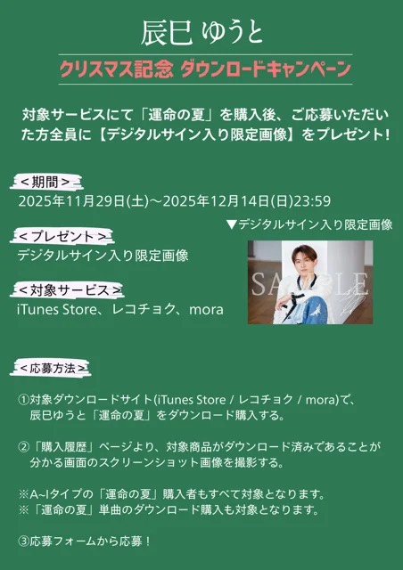 辰巳ゆうとから一足早いクリスマスプレゼントとして、ダウンロードキャンペーンを開催!対象サービスにて辰巳ゆうと「運命の夏」を購入後、ご応募いただいた方全員に【デジタルサイン入り限定画像】をプレゼントいたします!