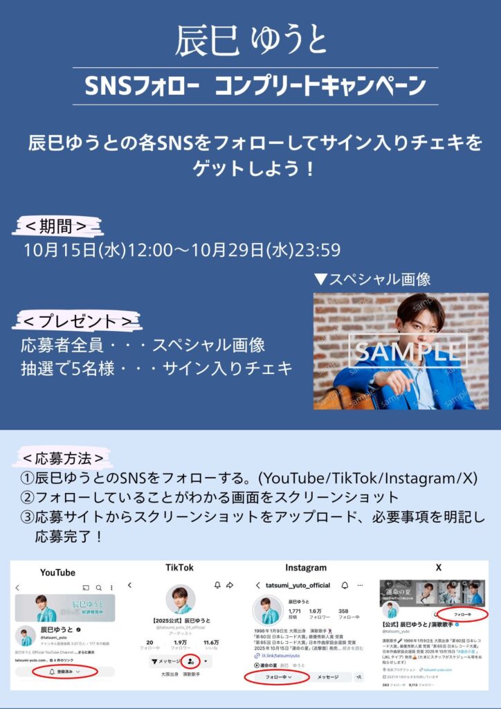 辰巳ゆうと SNSフォロー コンプリートキャンペーン開催決定!