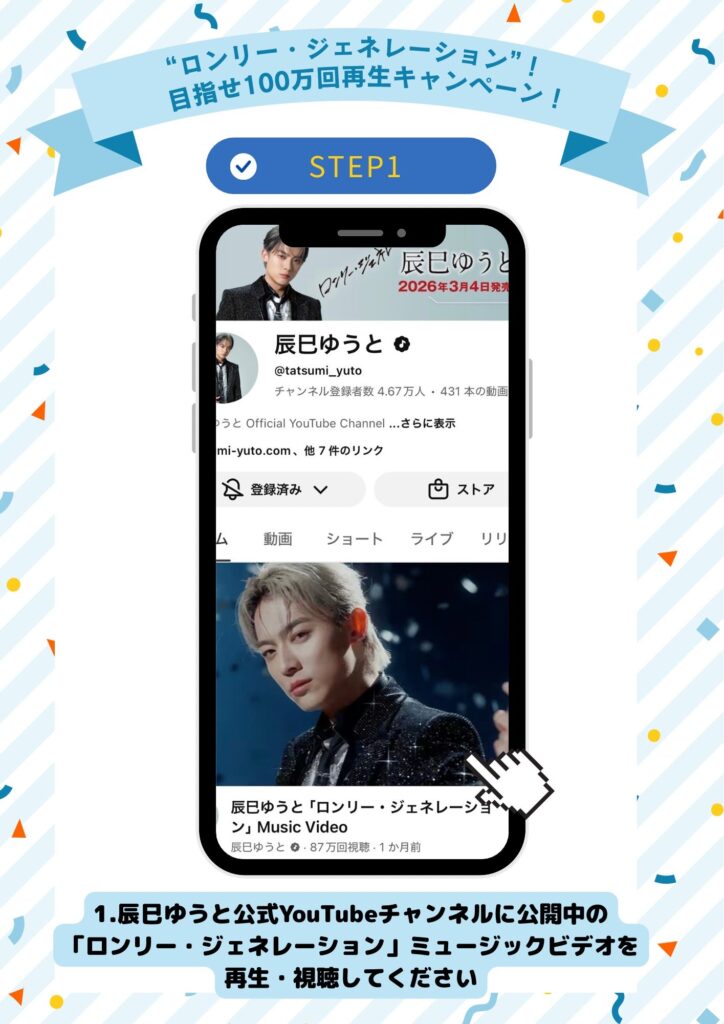 辰巳ゆうと公式YouTubeチャンネルにて公開中の『ロンリー・ジェネレーション』ミュージックビデオの【目指せ100万回再生】キャンペーンを開催いたします!